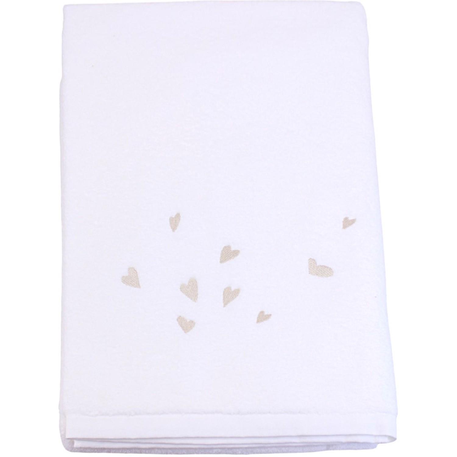 Drap de douche en éponge coton peigné, coloris blanc avec de beaux petits coeurs brodés dans des tons de beige sur le bas. Collection Jolis coeurs Sylvie Thiriez.