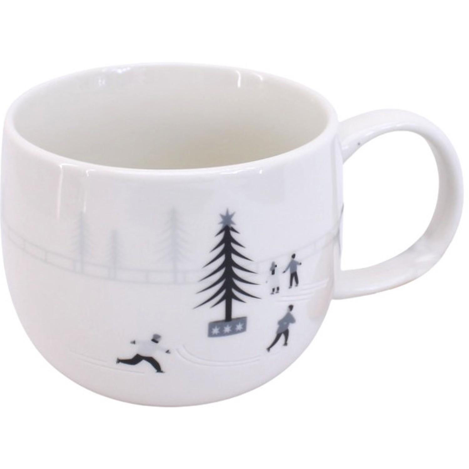 Un joli mug montagnard en porcelaine, blanche avec motifs très fins noir, peints à la main, personnages en patins à glace...