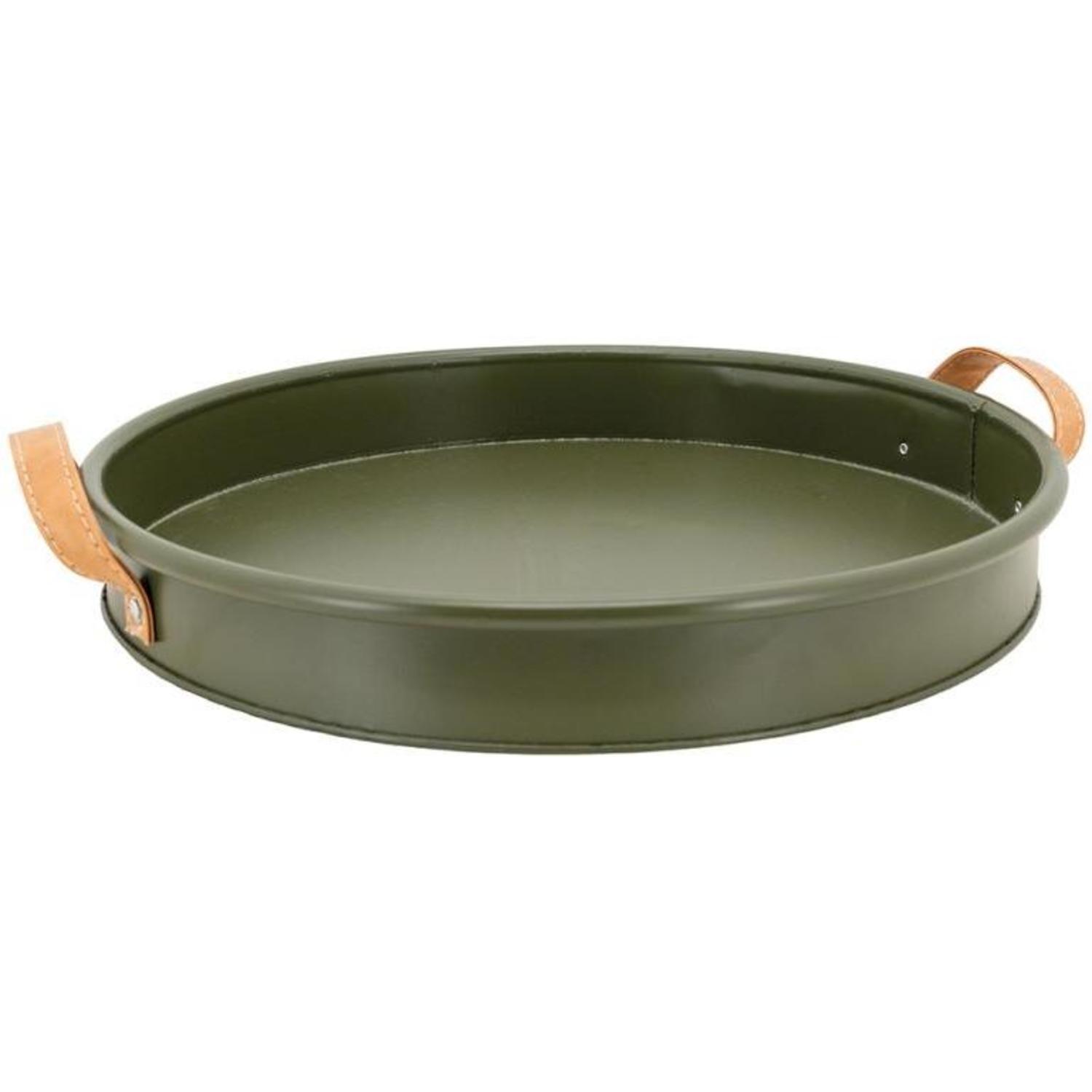 Un joli plateau rond en métal coloris vert mate avec deux petites anses en polyuréthane effet cuir camel.