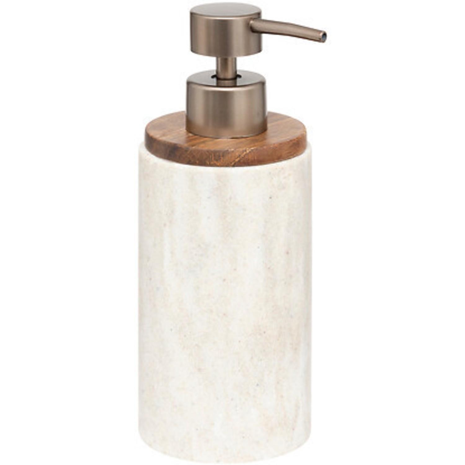 Dispenser per sapone liquido in poliresina con effetto pietra beige e dettaglio in legno naturale. La pompa in metallo satinato bronzo/argento aggiunge un tocco moderno minimalista, perfetto per bagni dallo stile montano contemporaneo. Dimensioni compatte: 7 × 19 × 7 cm, ideali per appoggiarlo su lavelli o mensole senza ingombrare.