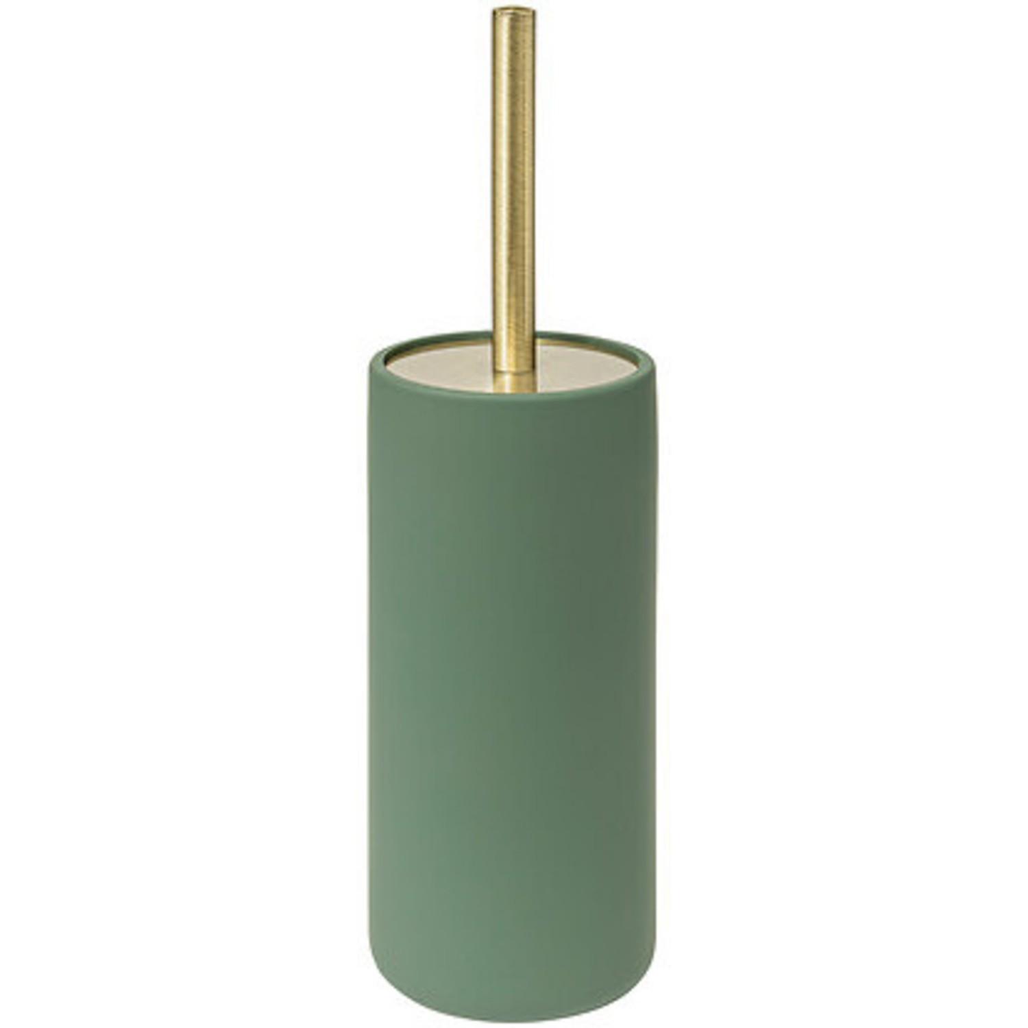 Porta scopino da bagno a forma cilindrica in ceramica/plastica color verde salvia, con manico in metallo finitura ottone.