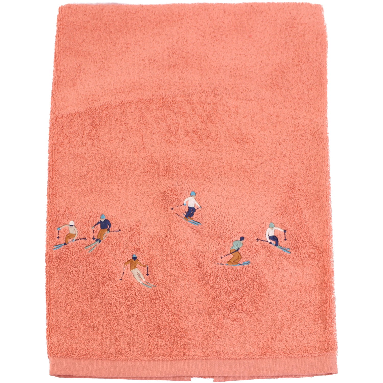 Porta lo spirito delle piste direttamente in bagno con il telo doccia fantasia Après-ski di Sylvie Thiriez. Realizzato in morbida spugna di cotone pettinato di alta qualità, assorbe subito l’umidità lasciando la pelle asciutta e coccolata. Il colore corallo/pesca è vivacizzato da piccoli dettagli multicolore (blu, bianco, verde) e, sul bordo inferiore, spicca la simpatica ricamatura di piccoli sciatori: un tocco giocoso che ricorda le giornate sulla neve.