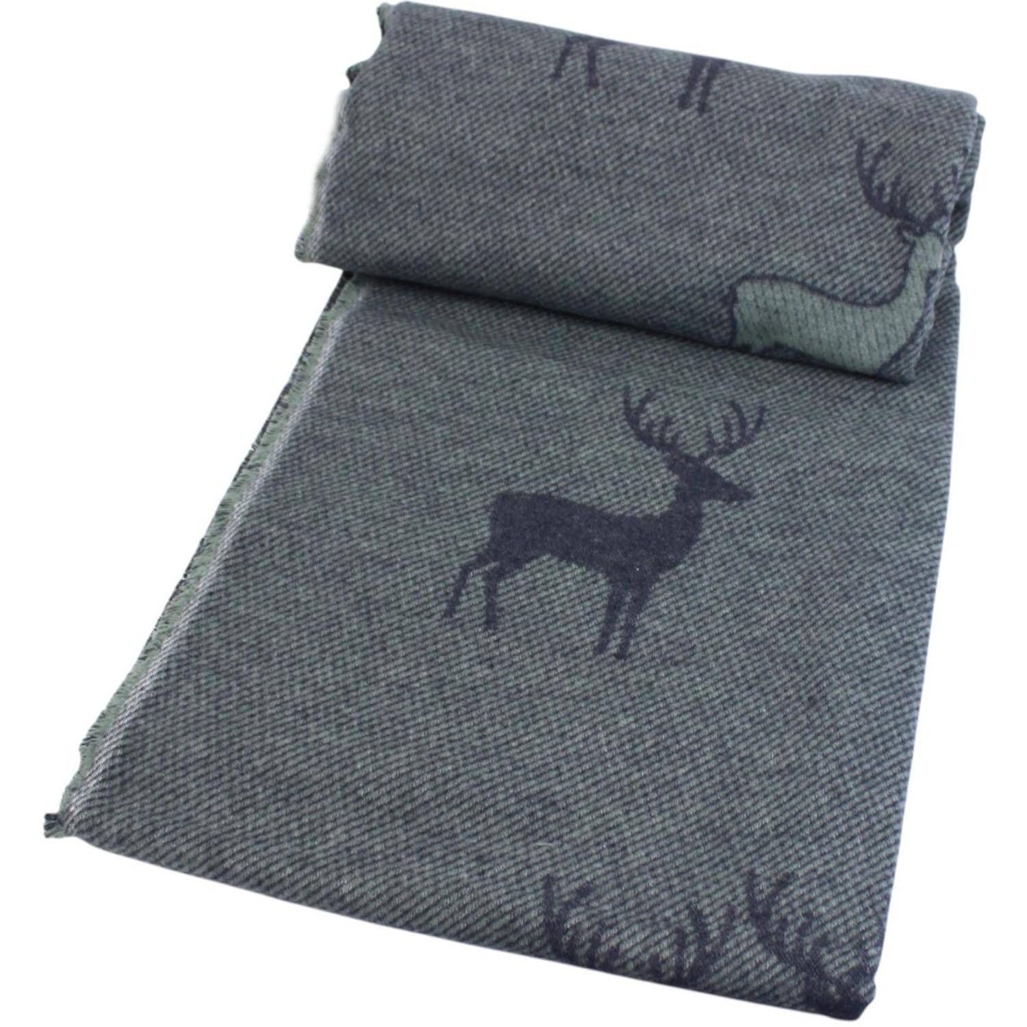 Morbido plaid 140x200 cm in flanella dai toni grigio scuro e nero, effetto mélange. Il disegno raffigura eleganti coppie di cervi distribuite uniformemente su tutta la superficie, per un tocco di autentico stile alpino.