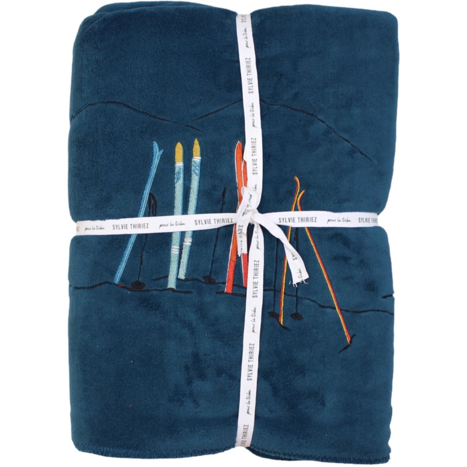Il bordo rifinito a punto cavallo e i piccoli ricami di sci richiamano l’atmosfera alpina della collezione Passe-Montagne firmata Sylvie Thiriez.