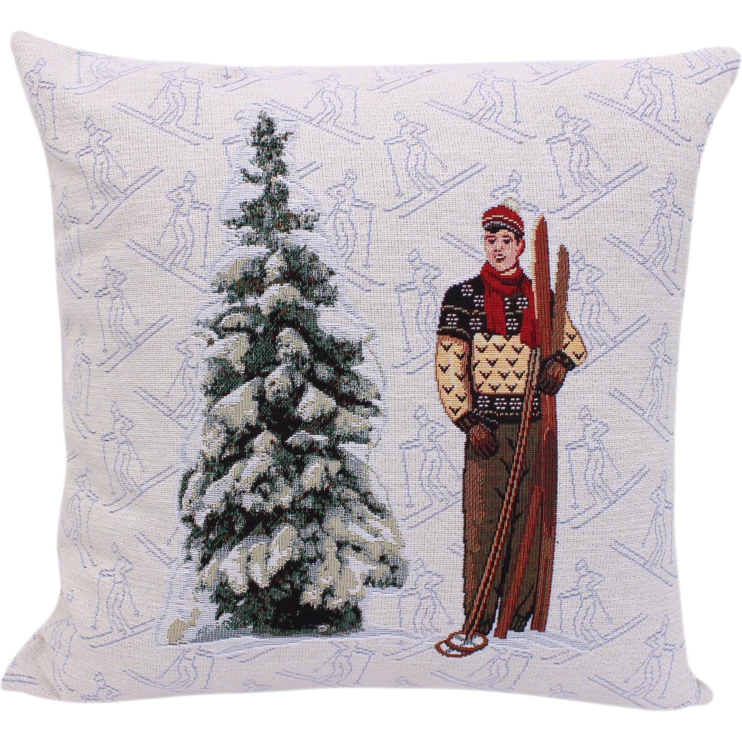 Un cuscino retro: motivo effetto punto croce con sciatore e abete su fondo écru e grigio, nei toni bianco, verde abete, rosso, marrone e nero.