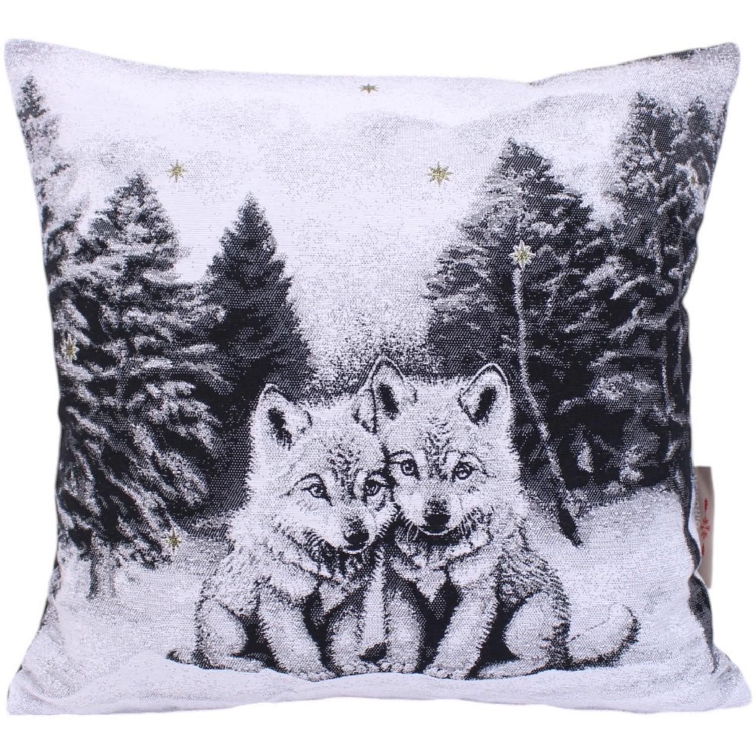 Un grazioso cuscino con adorabili cuccioli di lupo nella neve, in bianco e nero, impreziosito da piccole stelle dorate.
