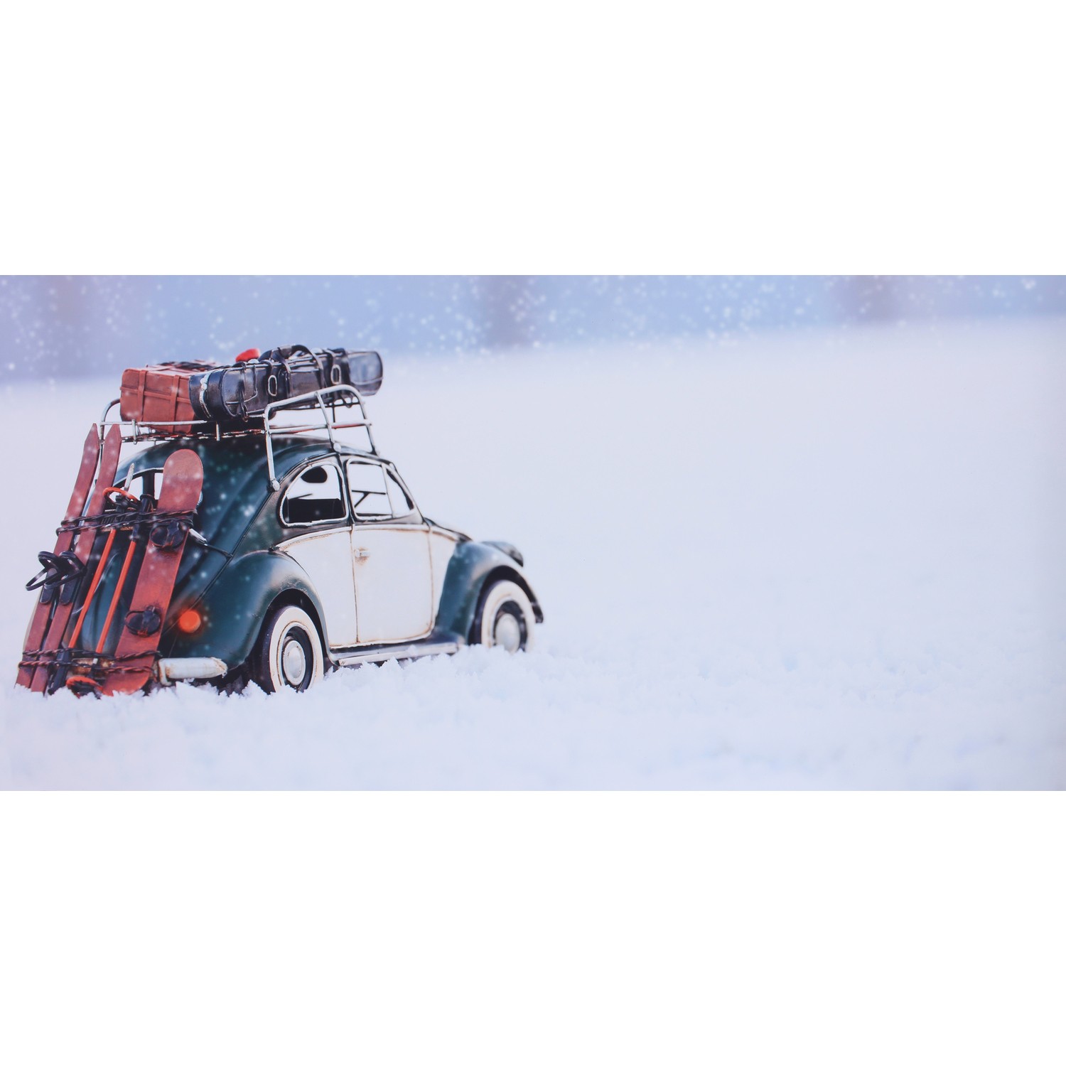 Scatto originale di un vecchio Maggiolino che sfreccia sulla neve, visto da dietro, carico di tutto il necessario per la tua vacanza in montagna: sci, snowboard, valigie e bastoncini!