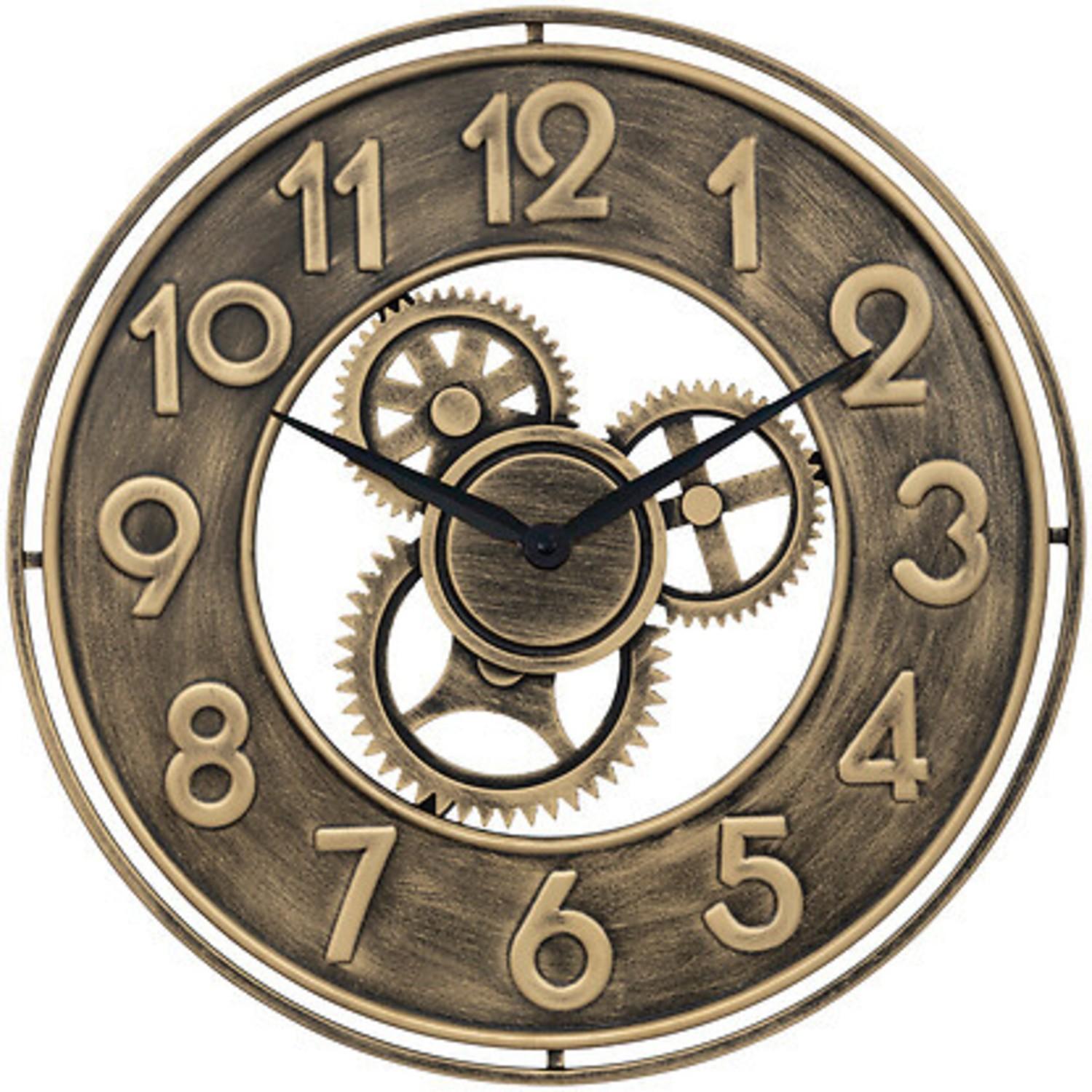 Orologio rotondo dallo stile vintage-industriale, impreziosito da un realistico effetto ingranaggi a vista. Realizzato in metallo con finitura patinata nero e ottone/oro, aggiunge subito carattere a qualsiasi soggiorno, cucina o chalet di montagna.
