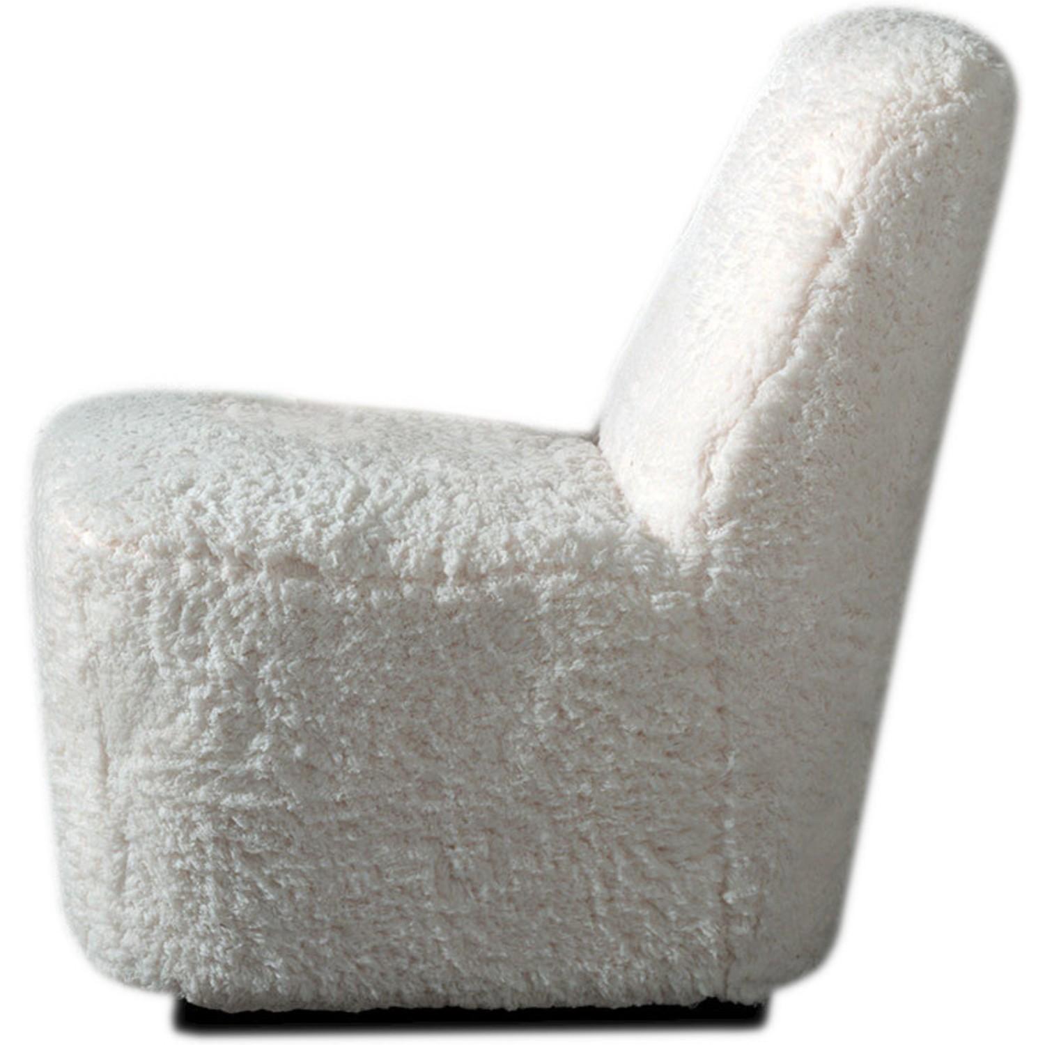 Poltrona con struttura in pino massello e multistrato. Seduta con imbottitura in schiuma poliuretanica 24 kg/m3 su cinghie elastiche, schienale 20 kg/m3. Rivestita in morbido tessuto bouclé 100% poliestere dall'effetto peloso, colore bianco/crema. Piedini in catalpa massello laccato nero da avvitare.