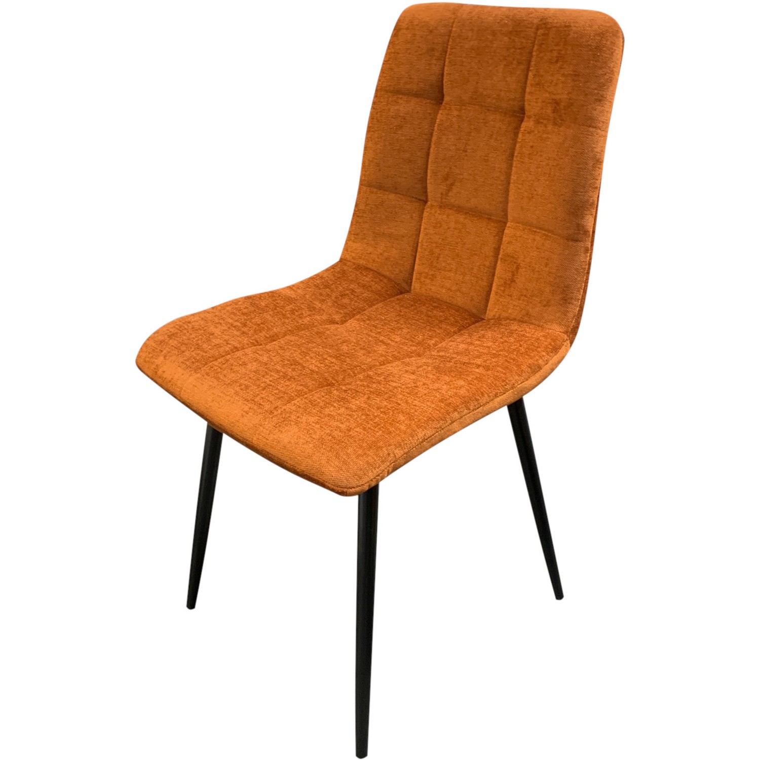 Una sedia dal design originale, con seduta e schienale in tessuto e gambe in metallo nero.