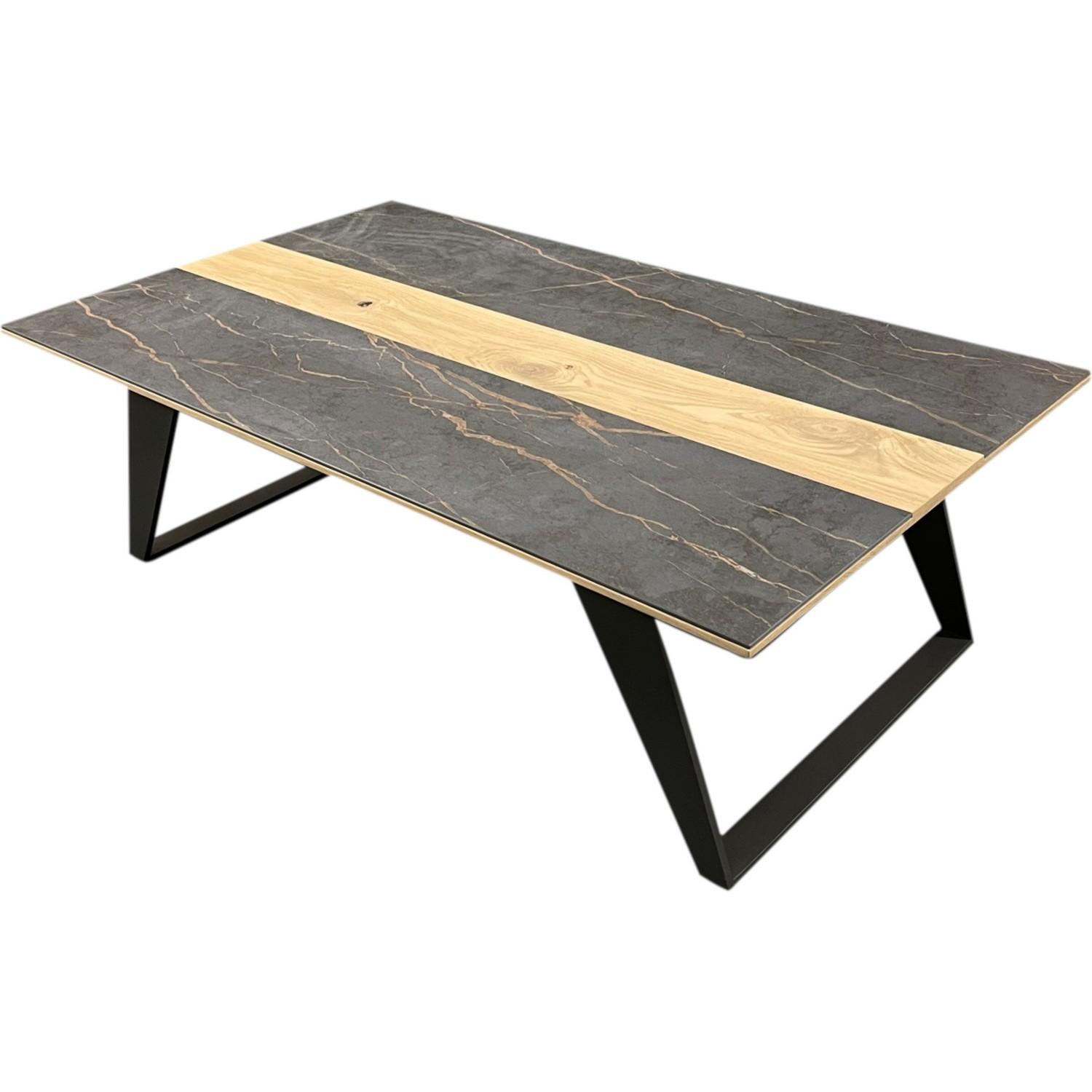 Elegante tavolino da salotto con piano in ceramica effetto pietra e inserto centrale in impiallacciato di rovere rustico, finitura beige legno chiaro. Il basamento in metallo verniciato nero epoxy, dalle linee sottili, alleggerisce l’insieme e dona un look moderno-industriale al tuo living.